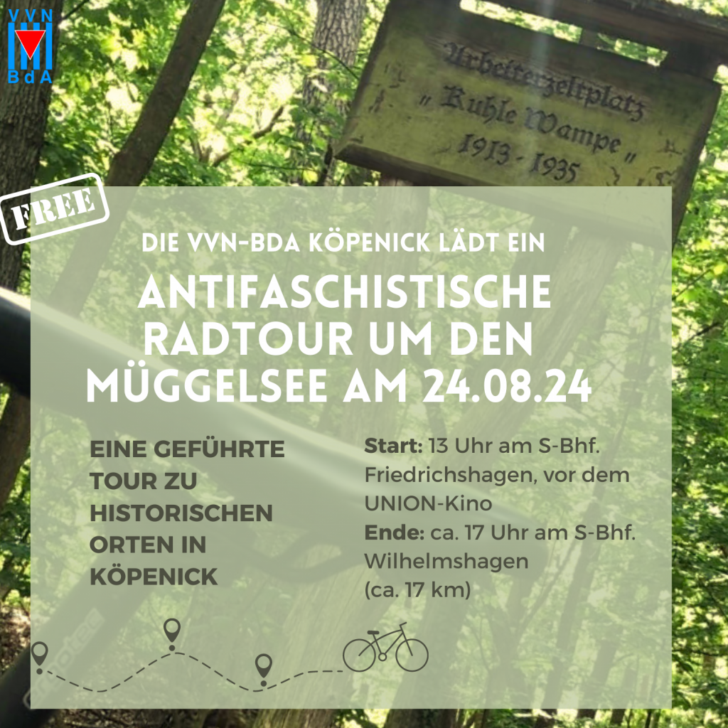 Die VVN-BdA Köpenick, das Zentrum für Demokratie und das Dokumentationszentrum NS-Zwangsarbeit bieten am 24. August 2024 eine geführte Fahrradtour um den südlichen Teil des Müggelsees an. Wir wollen an verschiedenen Stationen Halt machen, um dort mit kurzen Inputs zu selten erzählten Geschichten (u. a. von Arbeiter*innen, Widerständigen, politisch Oppositionellen, Zwangsarbeiter*innen) über Köpenick in der NS-Zeit schwerpunktmäßig zu informieren. Einige Stationen unserer Tour werden u. a. der Originalstandort der Kuhlen Wampe, die Berliner Bürgerbräu AG, das frühere KZ-Außenlager in Müggelheim und das ehemalige Durchgangslager in Wilhelmshagen sein.