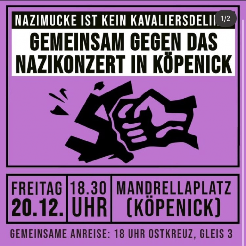 Veröffentlicht unterAllgemein|Verschlagwortet mitAllgemein|Kommentare deaktiviert für Geteilter Aufruf zum 20.12.2024: Nazimucke ist kein Kavaliersdelikt – Gemeinsam gegen das Nazikonzert in Köpenick!