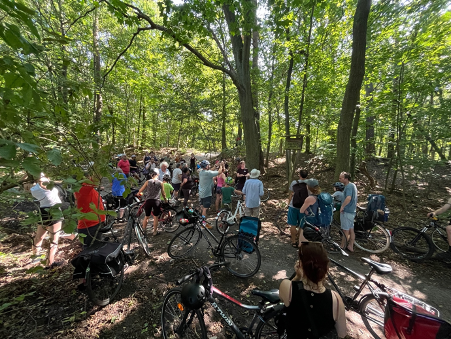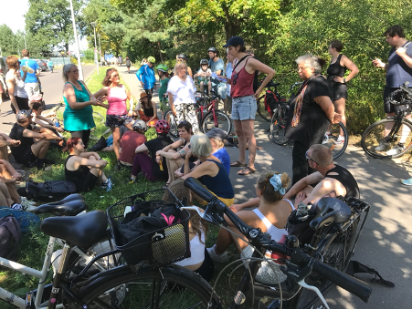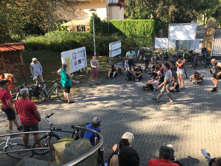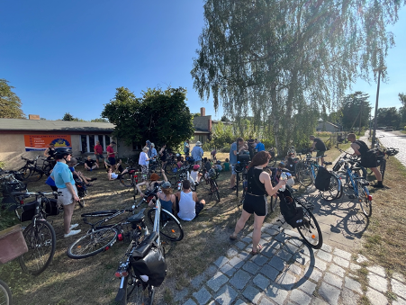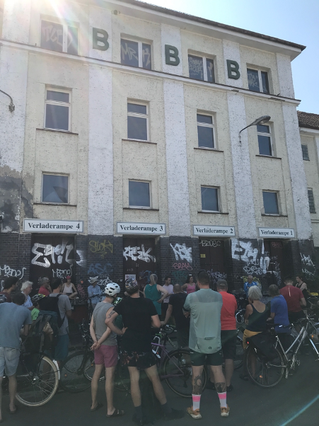 An diesem sehr heißen August-Sonnabend bei Temperaturen um die 30 Grad waren wir fünf Stunden mit unseren Fahrrädern unterwegs und haben circa 15 Kilometer zurückgelegt. An acht Stationen gab es einen 5-10 minütigen Input zur Geschichte und den Hintergründen der gewählten Station. Wir waren sehr überrascht, dass wir trotz der Hitze fast 50 Teilnehmer*innen gezählt haben.