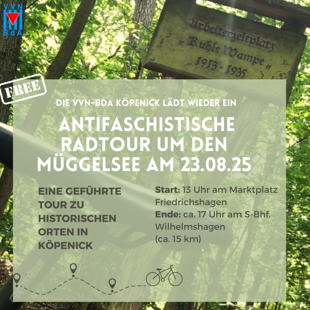 Die VVN-BdA Köpenick, das Zentrum für Demokratie und das Dokumentationszentrum NS-Zwangsarbeit bieten am 23. August 202s5 wieder eine geführte Fahrradtour um den südlichen Teil des Müggelsees an. Wir wollen an verschiedenen Stationen Halt machen, um dort mit kurzen Inputs zu selten erzählten Geschichten (u. a. von Arbeiter*innen, Widerständigen, politisch Oppositionellen, Zwangsarbeiter*innen) über Köpenick in der NS-Zeit schwerpunktmäßig zu informieren. Einige Stationen unserer Tour werden u.a. der Originalstandort der Kuhlen Wampe, die Berliner Bürgerbräu AG, der Wilhelmshagener Ulmenhof und das ehemalige Durchgangslager “Berlin Ost” in Wilhelmshagen sein.