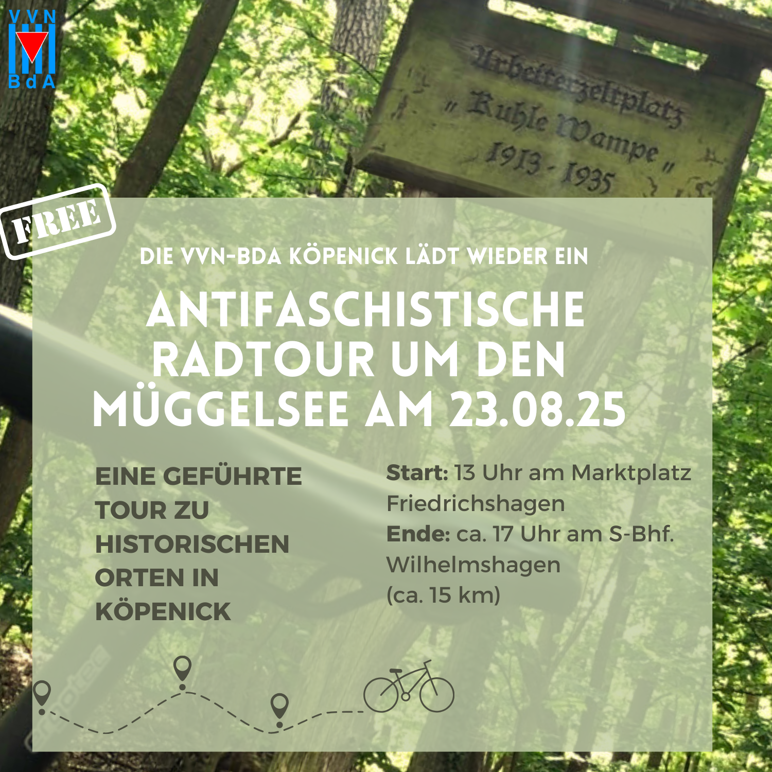 Die VVN-BdA Köpenick lädt auch dieses Jahr zu einer kostenfreien Radtour am 23. August 2025 ein. Wir wollen durch kurze Inputs an historischen Orten unbekannte Geschichten von Arbeiter*innen, Widerständigen und politisch Oppositionellen sichtbar machen. Dabei soll es Gelegenheit geben sich mit Gruppen vor Ort zu vernetzen.