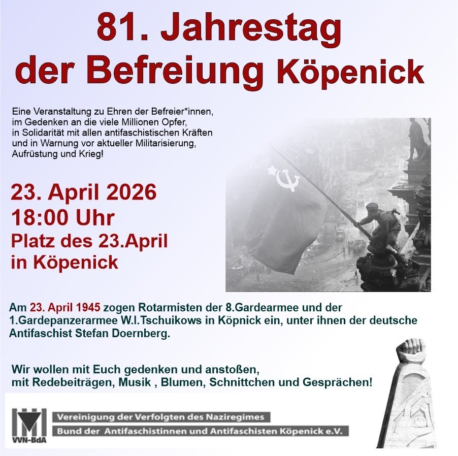 Mit dem Wachhalten der Erinnerung leisten wir unseren Beitrag, die von den Nazis ermordeten Köpenicker*innen ebenso wie die alliiierten Befreier*innen nicht in Vergessenheit geraten zu lassen. Wir wollen die Befreier*innen ehren, der Millionen Opfer gedenken, unsere Solidarität mit allen antifaschistischen Kräften ausdrücken und vor der aktuellen Militarisierung warnen.