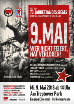 wir feiern auch dieses Jahr am  9. Mai 2018, dem 73. Jahrestag des Sieges, im Treptower Park zur Erinnerung an die Befreiung vom Faschismus durch die Rote Armee ein großes antifaschistisches Fest, zu dem wir euch herzlich einladen wollen.